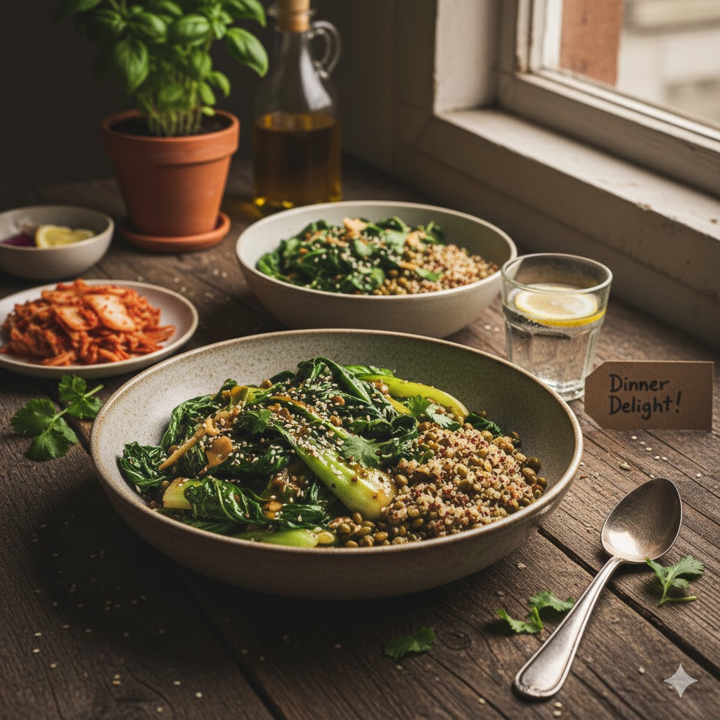 Dinner Delight (7:00 PM): Savory Lentil & Roasted Bok Choy with Quinoa