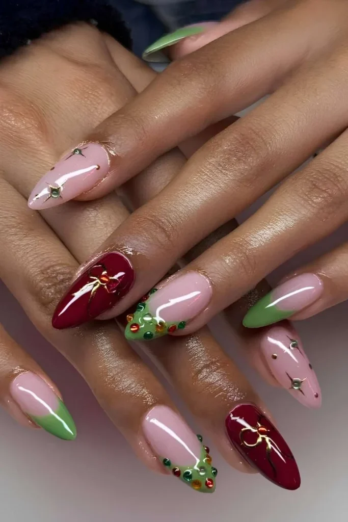 Red and green mismatched Frenchies with chrome bows and colorful rhinestones. It’s basically a Christmas tree on your fingers, and the commitment to the theme? Respect. No notes.
