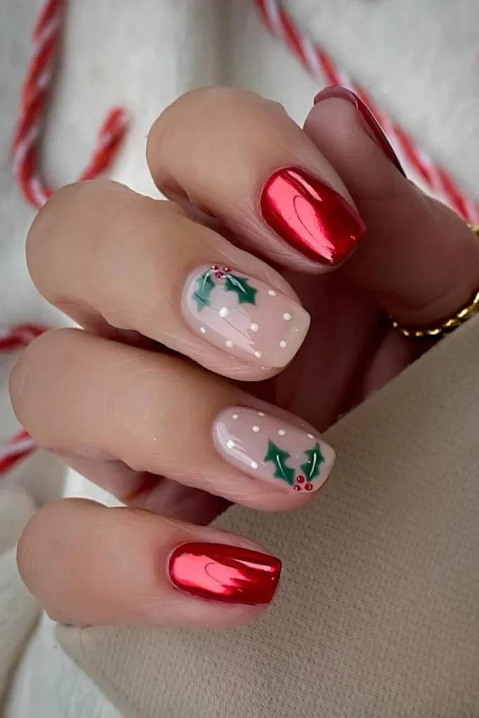 Alternate between red chrome and milky white nails with tiny holly berry accents. It’s classic Christmas nail art, but we’re making it extra cute for December 2025.
